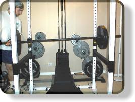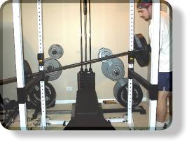 Start by setting a flat bench in the rack. Set the safety rails to a point a few inches above the bottom point of the rep (you're going to have to have enough room to slide yourself out from under the bar). Set the racking pins (the small hooks where the weight rests against the frame)above the safety rails. You will be unracking the weight from these pins. You will basically be setting up a bench press station inside the rack.