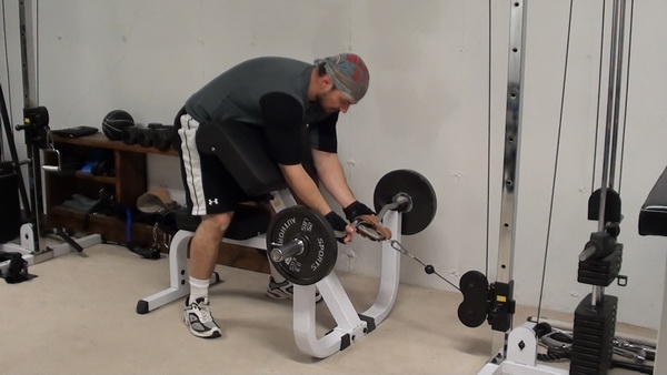 Set the Preacher bench in front of the low pulley (a few feet back from it). Start with the empty bar on the floor. The setup I prefer to use is an ankle strap around the bar then clipped to the low pulley. It makes it VERY easy to set up and perform Hybrid exercises.