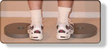 To work the outer calves, use two plates with about six inches of separation between them. Place the outer front quarters of your feet on the sides of the plates. Your feet will be tilted down and in. Roll up and do a calf raise then return to the start position.