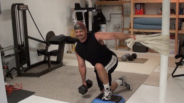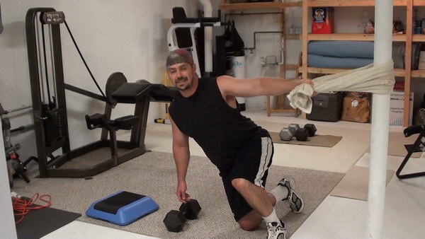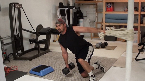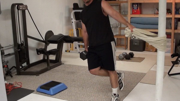 Technically, the version of the exercise I'm going to show you with the towel wrapped around a solid post is a step-back lunge because you'll touch your back leg to the ground.