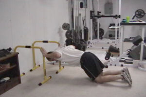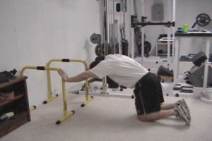 Kneel down about a foot in front of the equipment. The two pieces should just a little outside shoulder width apart. Set your hands on the corners of the two pieces and set your torso horizontal.