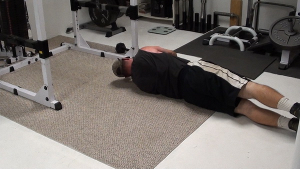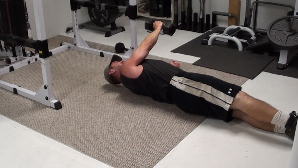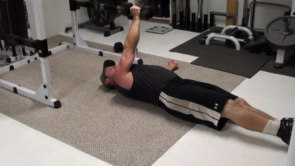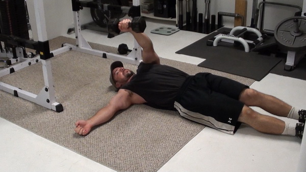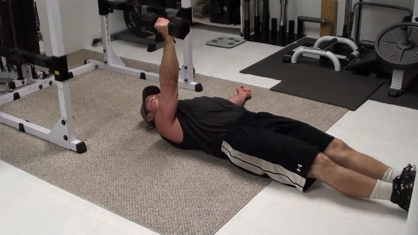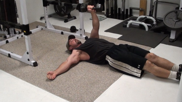 Lie on your back on the floor, legs straight, right arm directly out to the side (also flat on the floor...I like to make a fist to better develop tension). Hold the dumbbell above your body at arms-length.