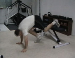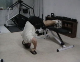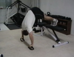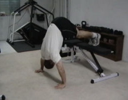 To get into position, all you need is a bench, a chair or some steps. Set your hands on the ground a little beyond shoulder width apart and about 2 feet in front of the bench. When your hands are planted, step back and up and set your toes on the bench. Bend only at your hips so your body forms an upside-down "L" shape.