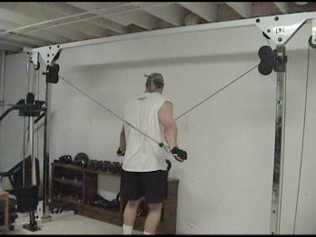 Grab the LEFT pulley handle with your RIGHT hand then step over and grab the RIGHT pulley with your LEFT hand. The cables will be crossing up right in front of your face.