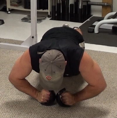 In this exercise, you're still doing a regular push-up...however, instead of having the round side down, you've got the HANDLE down with your hands on the round side. This opens up the hands, giving a unique stimulus to the pecs.